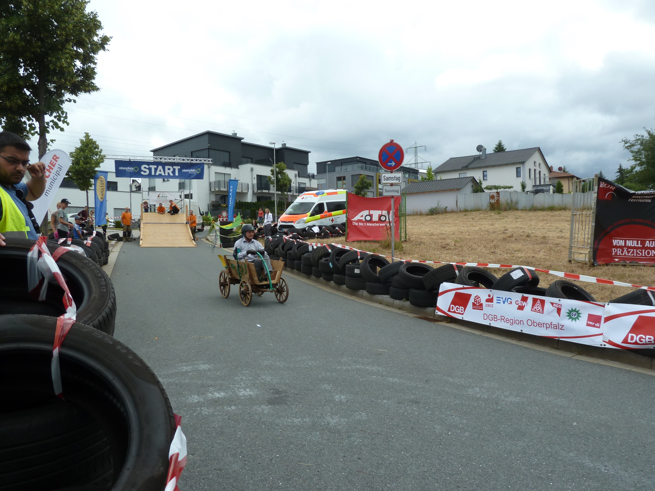 Obwohl das Gefährt wirklich schwer zu lenken ist, haben es Gisela Helgath (im letzten Jahr) und Karl Bärnklau heil ins Ziel gebracht. Die Kiste soll sogar in der anspruchsvollen Rechtskurve auf allen 4 Rädern gedriftet sein – die Bodenhaftung der Eisen-Umreifung ist eben begrenzt…