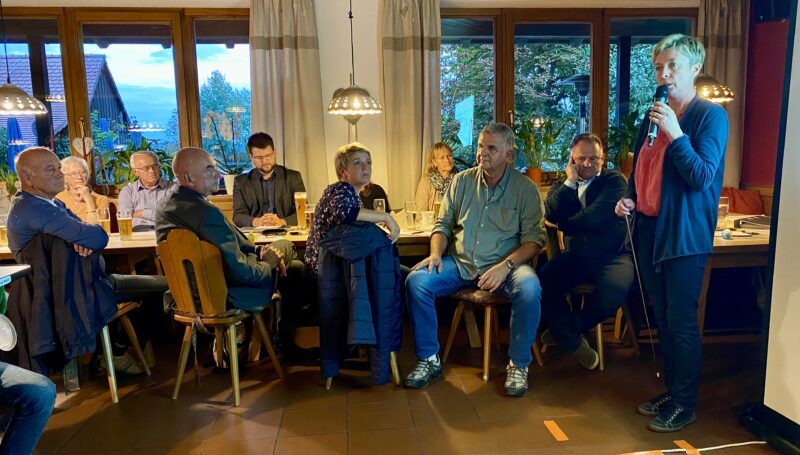 Karin Rittner (rechts) schildert, welche Umstände zur Gründung der Bürgerinitiative geführt haben; sie beschreibt, was die Anwohner des Flugplatzes bisher erdulden. Mit im Bild Christian Rittner (2.v.r.) und Hans Babl (3.v.r.), die Vorsitzenden der BI, und die Grünen-Abgeordneten Anna Schwamberger (5.v.r.), Johannes Becher (5.v.l.) und Jürgen Mistol (4.v.l.).