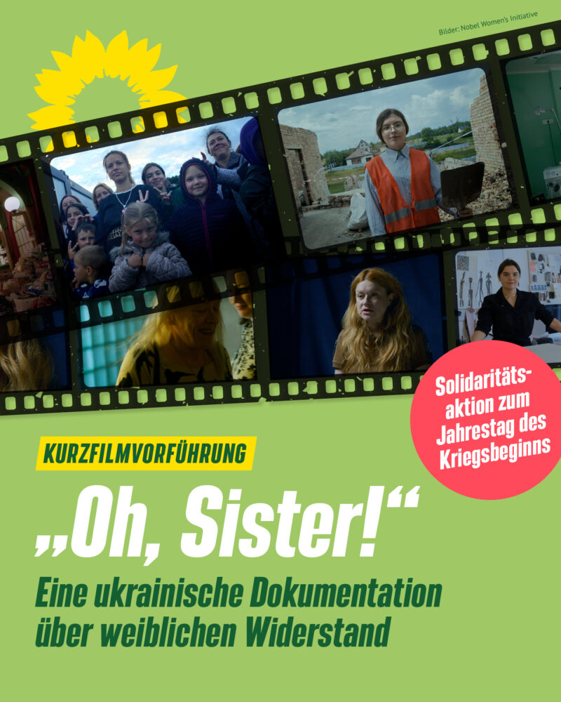Der Grünen-Kreisverband veranstaltet zum Jahrestag des Kriegsbeginns in der Ukraine am Freitag, 24.2.23 um 19 Uhr einen Filmabend in den Räumen des Kunstvereins, bei dem der Kurzfilm „Oh, Sister!“ gezeigt wird. Es handelt sich um einen 20-minütigen Dokumentarfilm über ukrainische Frauen, die sich den Herausforderungen der russischen Invasion stellen und für Frieden, Gerechtigkeit und Freiheit in der Ukraine kämpfen.